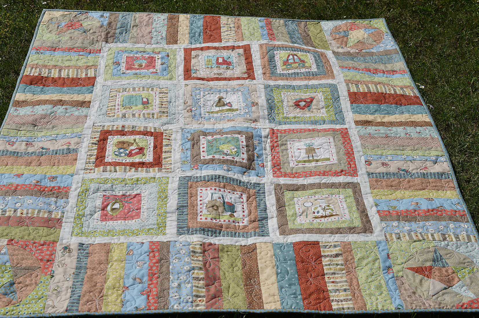 Krásná, okatá, veselá dětská deka, z panelů a látek návrhářky A. Downs.